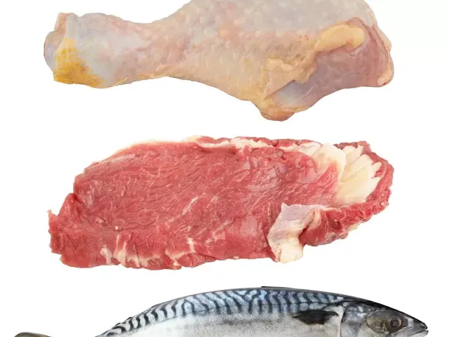 From top: chicken, meat, and fish
