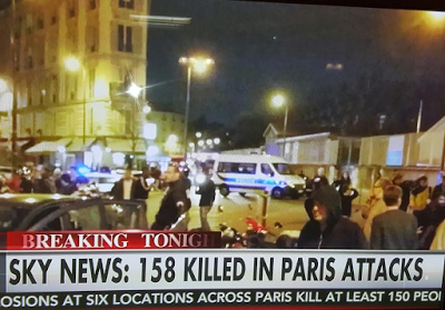 Terrorists wielding AK-47s and throwing explosives executed at least 118 people inside a Paris concert hall at the Bataclan late Friday night, in a massacre that followed coordinated attacks that killed at least 40 more people, rocking the French capital, prompting President Francois Hollande to close the entire nation's borders and declare a state of emergency. The death toll has increased from 60 to 158 according to latest reports.