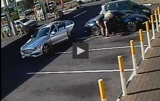 CCTV footage shows a robbery on Sunday at 3pm at a BP garage. The Footage shows a man walking to his car – as he gets into his car, a Mercedes-Benz pulls up behind his parked car and two men run towards him and rob him.