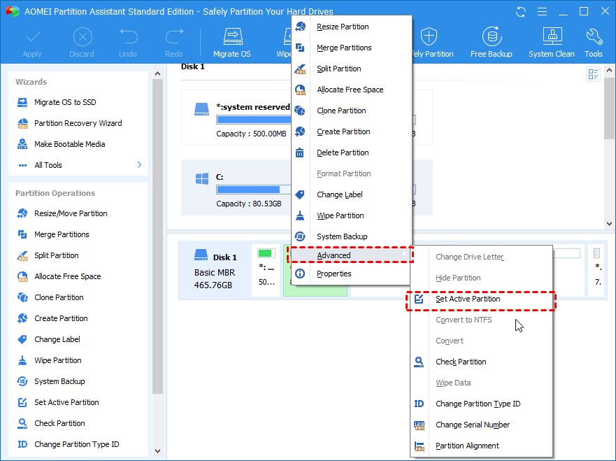 Step 1. After booting from the bootable repairing USB drive, right-click on the system partition, and select “Advanced” > “Set Active Partition”.Step 2. It will pop up a window saying that this act may make the other partition inactive, just hit “